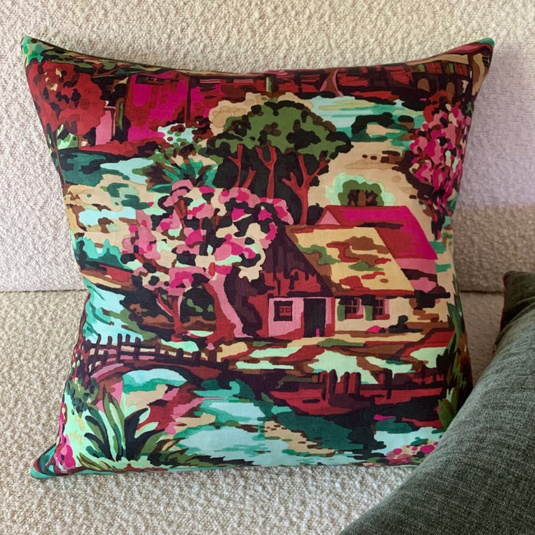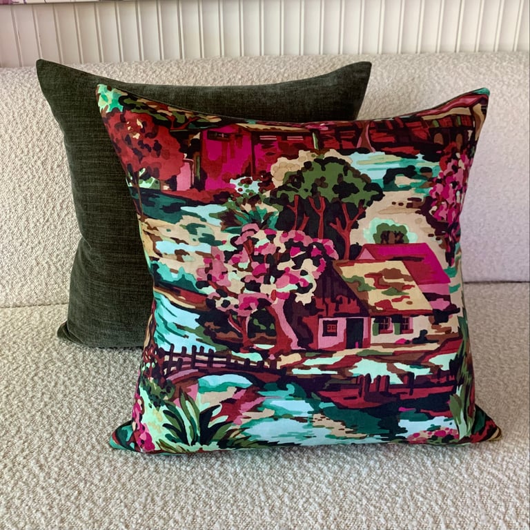 Our larger size 48 x 48cm Individually made from beautiful cotton sateen in French countryside Giverny print, with super soft touch khaki/moss green on the back.